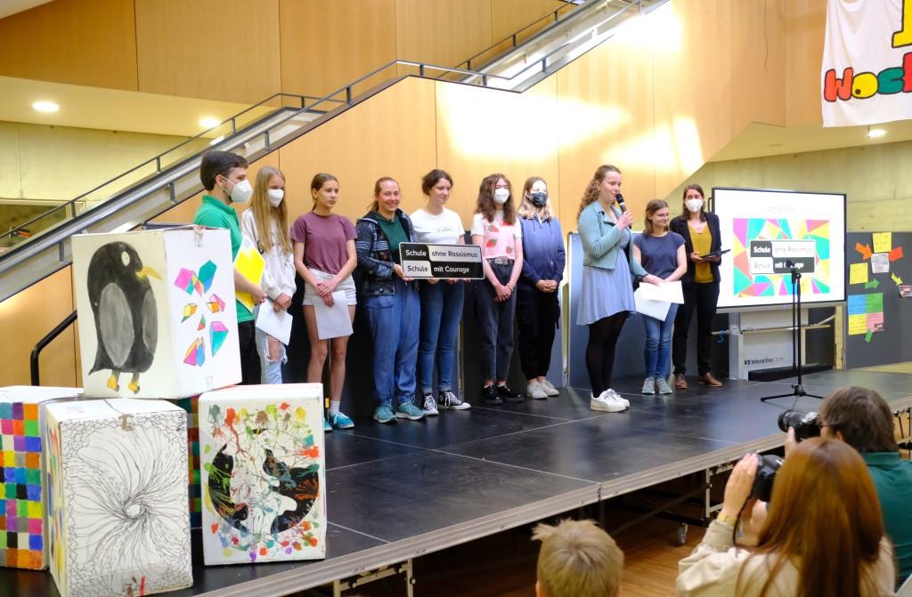 Über 70% der Schulgemeinschaft bestätigten mit ihrer Unterschrift die Aufnahme in das Netzwerk und verpflichtet sich, die oben genannten Ziele zu verfolgen sowie regelmäßig Aktionen zum Thema Diskriminierung und Zivilcourage durchzuführen. Nachdem wir die bilinguale Band „Zweierpasch“ als unsere betreuenden Paten gewinnen konnten, hat die offizielle Aufnahme durch die Landeskoordination am 30. Mai 2022 stattgefunden. Zur feierlichen Titelverleihung sollte die komplette Schulgemeinschaft eingebunden werden, sodass die AG für den Tag einen „Courage-Wettbewerb“ ins Leben gerufen hat. Unter anderem gab es für die Schüler:innen einen Kreativwettbewerb zum Thema „Courage zeigen“, zusätzlich hatte die AG mit Menschen der Schulgemeinschaft im Vorfeld Interviews geführt und ihnen Fragen zu ihrem Verständnis von Courage und ihren Wünschen für die Zukunft gestellt.